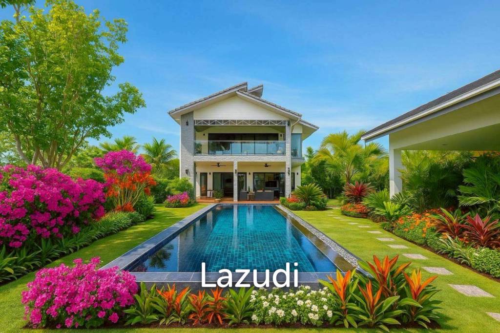 Discover this stunning two-story detached home located in the serene area of Thap Tai, Hua Hin. Positioned on an expansive 860 sqm plot, this contemporary property offers a generous 360 sqm of interior space, featuring four spacious bedrooms and four modern bathrooms.